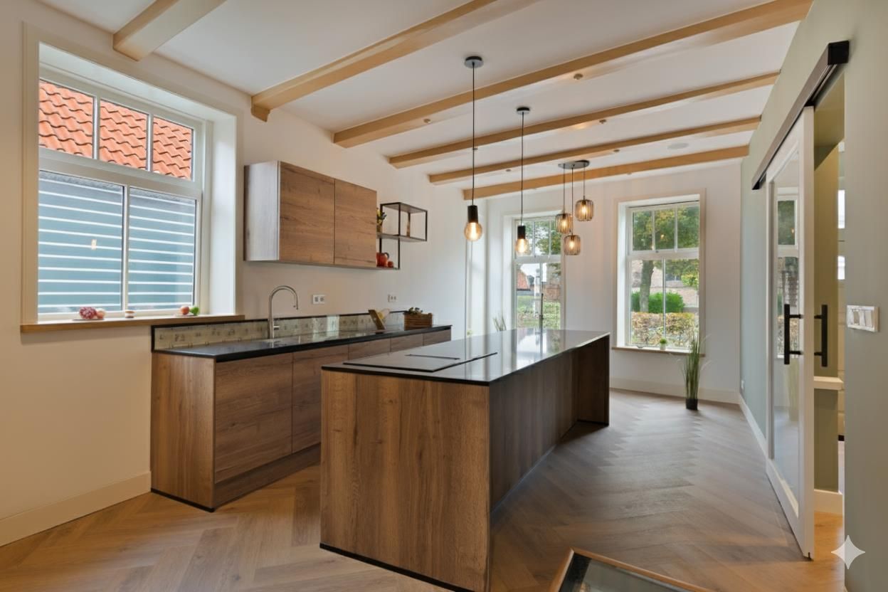 Via de volledig vernieuwde authentieke voordeur komt u binnen in de hal, die toegang biedt tot het toilet met fonteintje. Vanuit de hal loopt u door naar de moderne, ruime leefkeuken die van alle gemakken is voorzien. De keuken beschikt over hoogwaardige inbouwapparatuur, waaronder een oven op hoogte, een magnetron, koelkast en vriezer. Het zwarte marmeren aanrechtblad geeft de ruimte een luxe uitstraling. Koken doet u op de inductiekookplaat met geïntegreerde downdraft afzuigkap, en dankzij de Quooker heeft u altijd direct kokend water tot uw beschikking. Een bijzonder detail is het glazen vloerluik met zicht op de onderliggende wijnkelder, een echte blikvanger. De gerestaureerde Delfts-blauwe tegels geven de keuken bovendien een sfeervolle en karakteristieke uitstraling, waardoor oud en nieuw op harmonieuze wijze samenkomen.