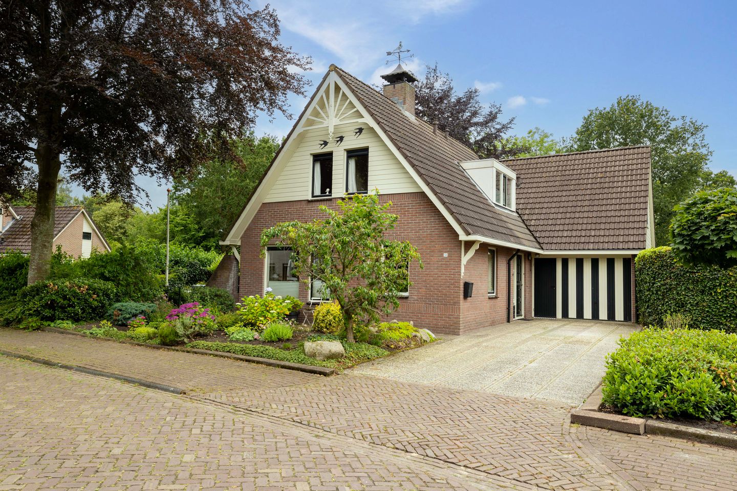 Rondom de woning: Aan de voorzijde van de woning is een oprit voor het stallen van 2 auto’s op eigen terrein en een verzorgde voortuin. Via het hekwerk aan de zijkant van de woning toegang tot de tuin op het Zuiden met doorloop naar de ruime achtertuin. De achtertuin gelegen op het Westen, biedt veel privacy door de groene begroeiing. In de achtertuin is een houten tuinschuur (voorheen duivenhok), een 2e tuinschuurtje voor gereedschap, een buitenkraan en zonnescherm aanwezig.