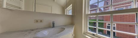 De badkamer is met dezelfde zorg afgewerkt als de rest van de woning. Deze beschikt over een inloopdouche en een wastafelmeubel, waarbij de kastjes zijn voorzien van echte porseleinen knopjes.