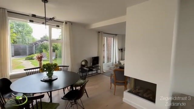Het zitgedeelte heeft openslaande tuindeuren met zicht op de tuin en een sfeervolle gashaard.