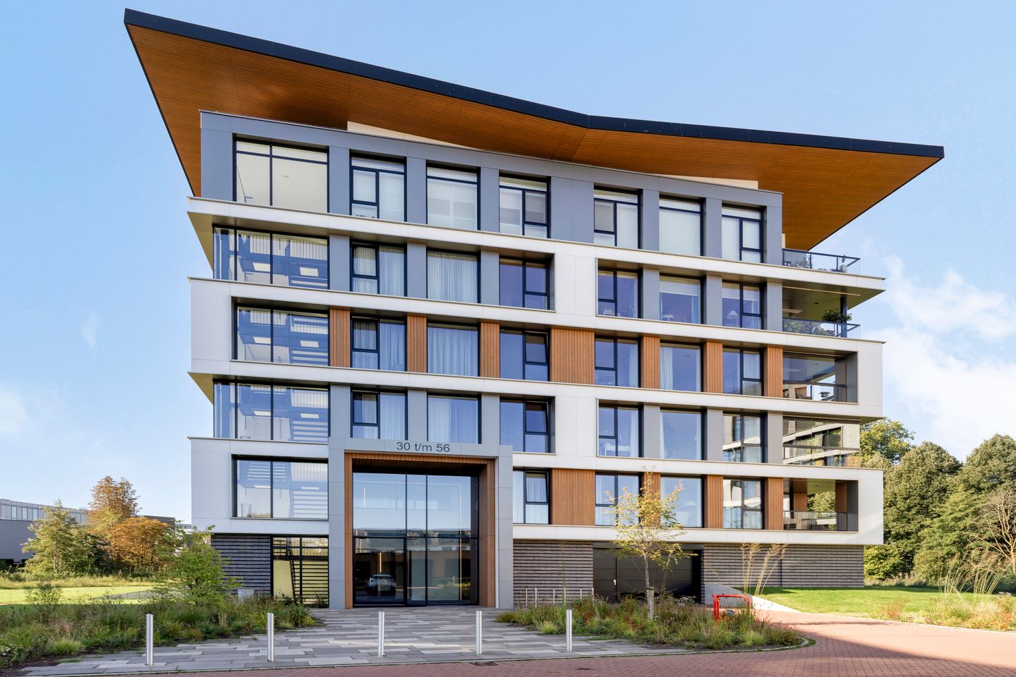 Dit royale appartement bevindt zich op de eerste etage, met een fraai uitzicht over de parkachtige tuinen en de gracht. Staal, hout, puntgaaf stucwerk en grote raampartijen bepalen het beeld. Door de weerspiegeling van de lucht in het vele glas rondom en het ogenschijnlijk losse vlinderdak ontstaat er een licht beeld, en ogen deze kolossen harmonieus en rank als ballerina’s.