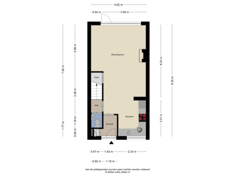 42 m² (8,80 meter diep en 4,80 meter breed)