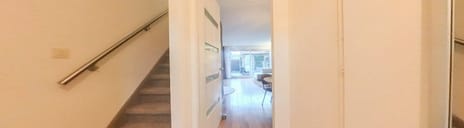 Aan de voorzijde zie je direct dat dit huis zeer netjes is onderhouden. Dit geldt ook voor de kleurrijke bestrating, bij de entree met bordes. In de hal ligt, net als in de woonkamer en keuken, laminaat op de vloer. Verder zie je de meterkast, trapopgang en mooie binnendeuren. Een van deze deuren geeft toegang tot de toiletruimte met fonteintje.