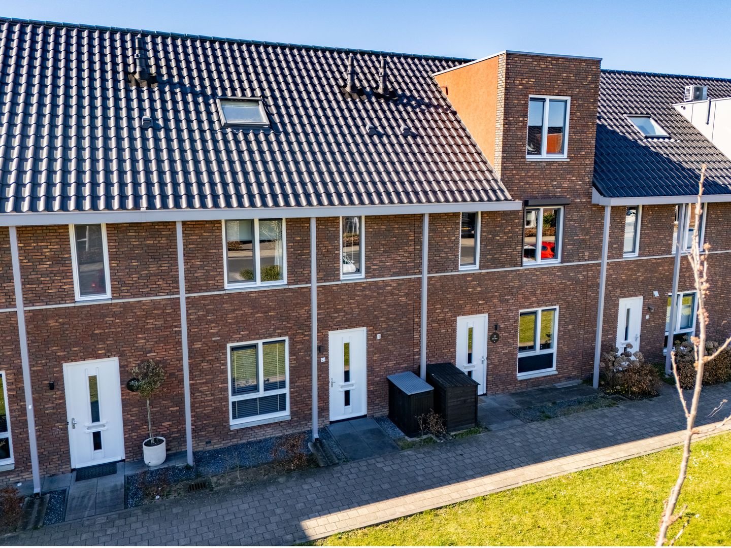 In het voortuintje zie je bestrating, grind, een beukenhaag en er is plek voor een containeropslag. En spelen de kinderen graag buiten, zet dan een bankje op het grind en geniet van de ochtend-/middagzon!