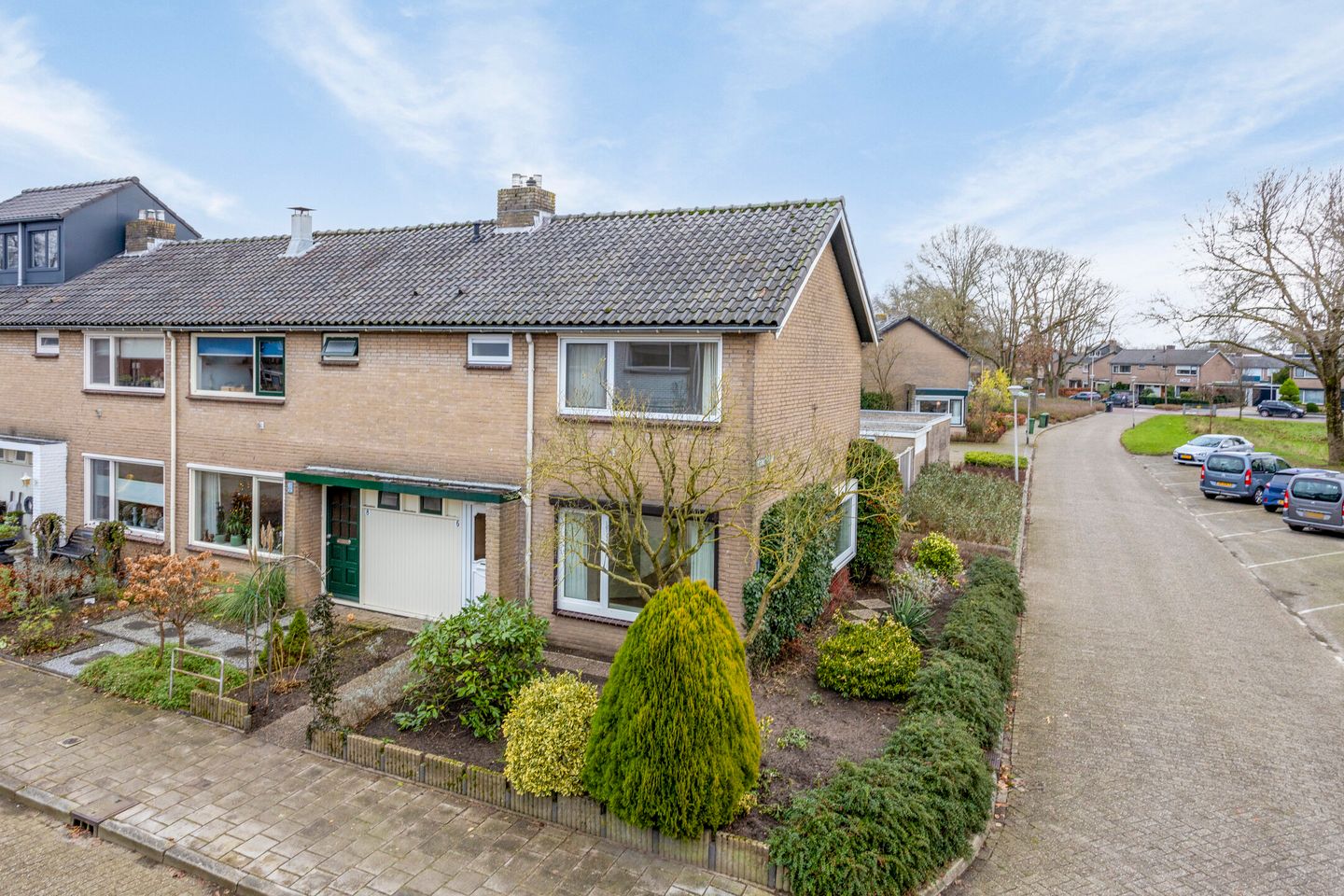 Deze woning heeft een mooi aangelegde voor-, zij- en achtertuin. Je ziet gevarieerde beplanting, die deels groenblijvend is. In de achtertuin, gesitueerd op het zuidoosten, is kunstgras gelegd en biedt het grote terras genoeg plek om in de zon te zitten. Aan de kant van de mooie, hardhouten schutting is een poort naar de openbare weg.