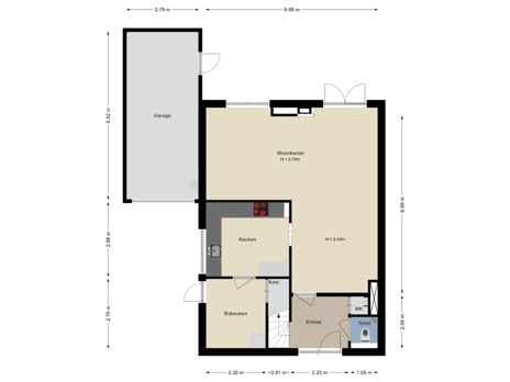 De aangebouwde garage heeft een lengte van iets meer dan 6.50 meter (binnenmaat), waardoor er genoeg plek is voor een auto, motor, de (kinder)fietsen en andere spullen. Niet alleen is er elektra, maar ook water en verwarming waardoor de garage ook heel geschikt is als hobbyruimte.