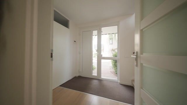 Nooit meer zoeken naar een parkeerplek, want bij deze woning kun je parkeren op eigen terrein. Vlak naast de oprit is de deur naar de bijkeuken, die de bewoners als dagelijkse entree gebruiken. De officiële entree is echter aan de voorzijde, onder het balkon. Achter de voordeur is de hal met de meterkast, trapopgang en de toiletruimte.
