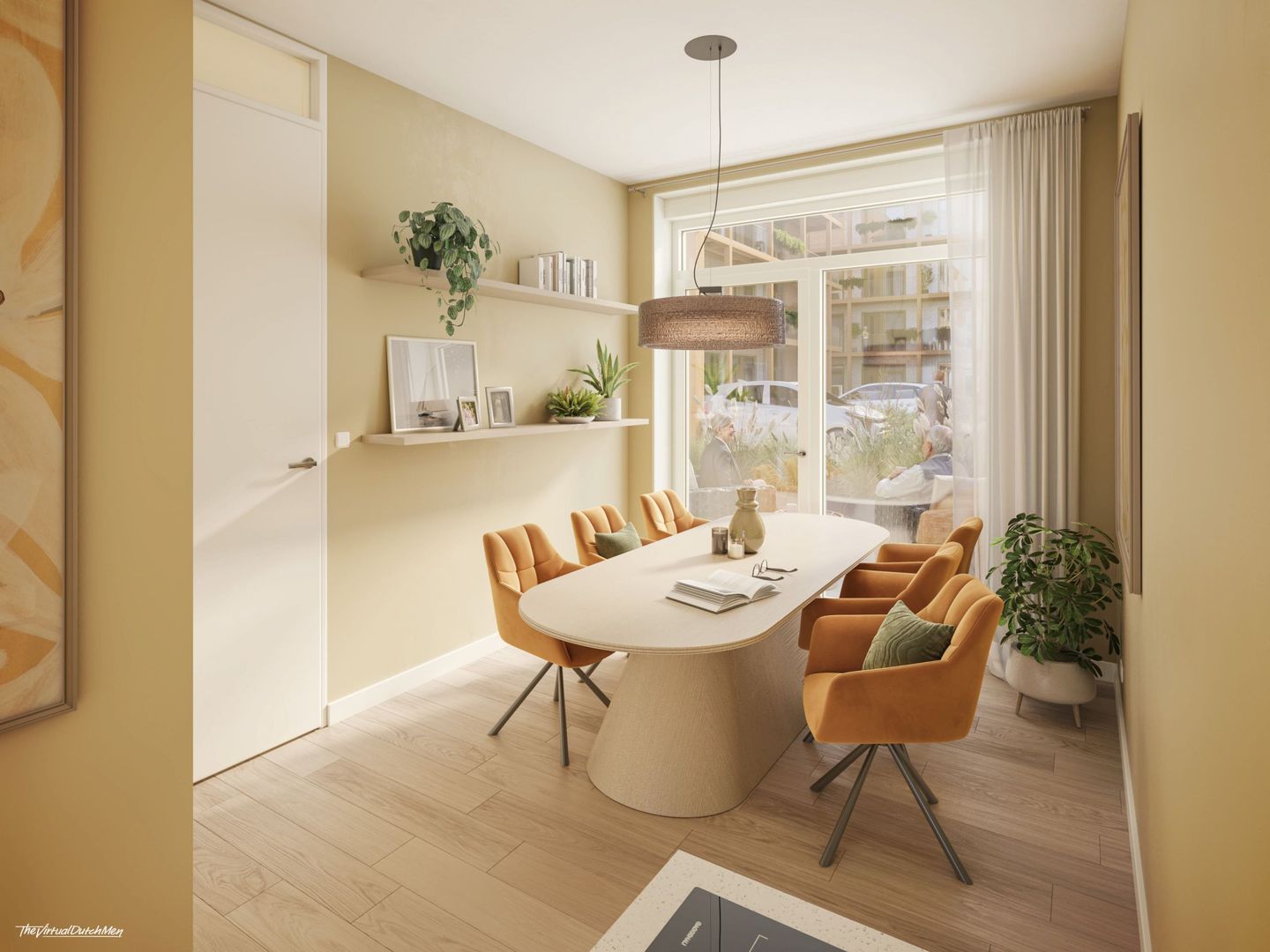 De getoonde interieurafbeeldingen betreffen de eetkamer van bouwnummer C0.10 en de woonkamer van bouwnummer C0.08. De buitenruimte en het uitzicht kunnen bij andere bouwnummers afwijken.