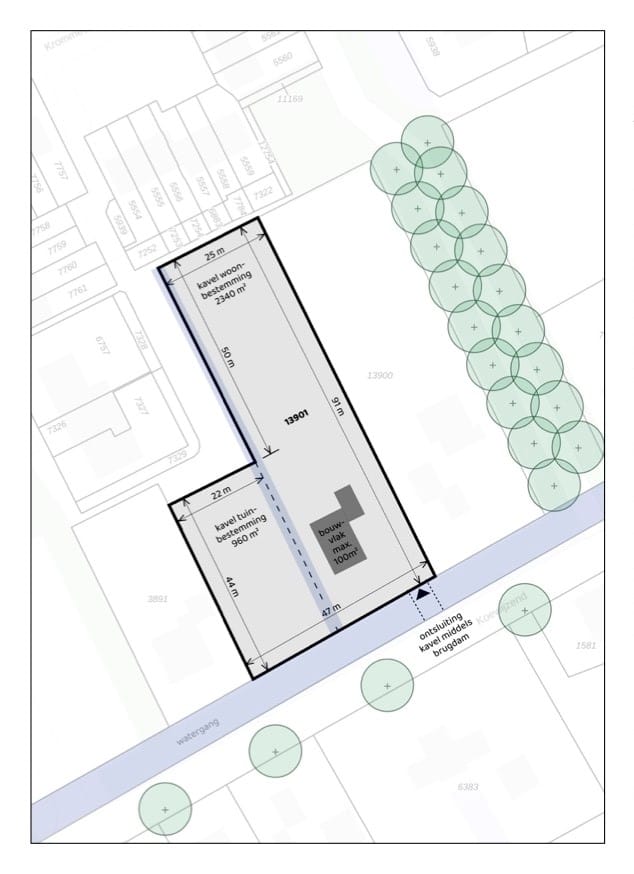 Kavel 1: De Chrysantenkas (naast Koewijzend 7 te Zwaag) heeft een oppervlakte van 3.300 m2. Op het oostelijke gedeelte van het perceel kunt u een vrijstaande woning realiseren. In de ruime tuin gelegen op het noordwesten kunt u altijd een terras realiseren richting het zuiden. Verder bezit u aan de westzijde van het perceel een eigen eiland met de bestemming tuin. Wie kan dat nu zeggen. De ontsluiting dient te worden gerealiseerd via een brug die toegang geeft tot de Koewijzend.