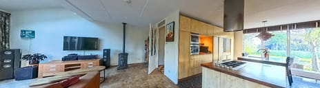 De woonkamer is qua grootte ook niet kinderachtig met een oppervlak van circa 41 m2. De woonkamer beschikt over een flinke pui brede raampartij met zicht op de tuin. Dit aangevuld met dakramen zorgt voor een weldadige daglicht toetreding en vergroot de ruimte beleving. De woonkamer is verder nog voorzien van een houtkachel hetgeen de behaaglijkheid & sfeer in de wintermaanden ten goede komt. Het gebruik van deze houtkachel resulteert tezamen met de zonnepanelen in zéer lage energiekosten.