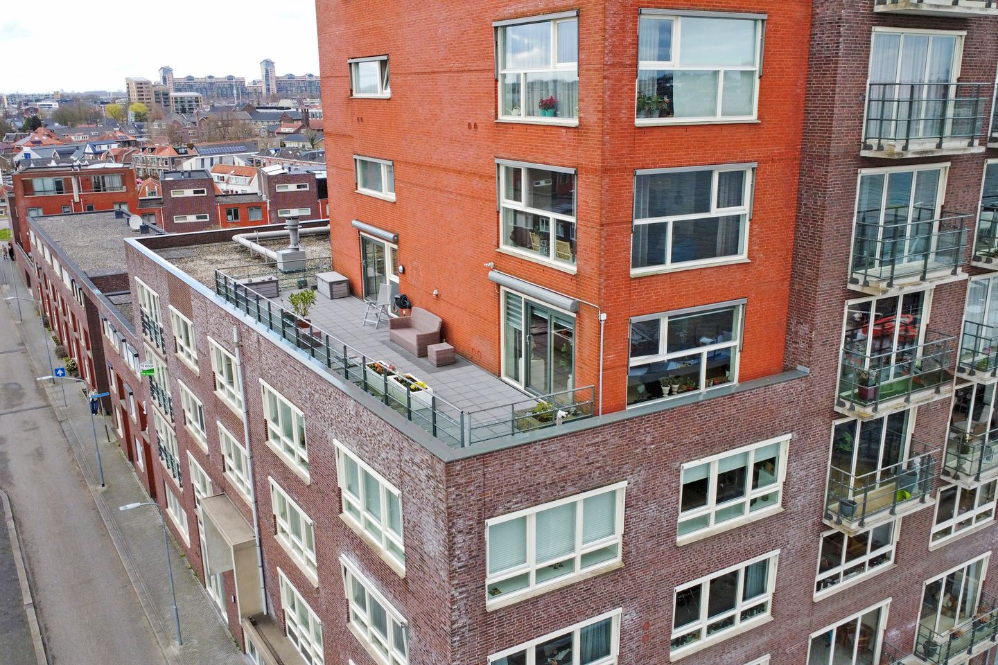 Normaliter hebben deze appartementen een loggia balkon aan de waterzijde. Dit appartement heeft behalve dit loggia balkon ook een XXL dakterras van 45 m2 aan de zijkant van het gebouw. Dit is de zonnige zijde op het zuidwesten. Vanaf dit dakterras heeft u wederom zicht op de rivier en voldoende ruimte voor ligstoelen en eettafel met meerdere stoelen. Het dakterras is zowel vanuit de woonkamer bereikbaar, maar ook vanuit de masterbedroom toegankelijk.