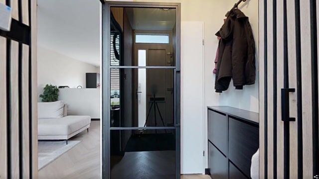 Entree in de hal met de garderoberuimte, de meterkast, moderne toiletruimte met een wandcloset en toegang tot de woonkamer middels een fraaie glazen deur.