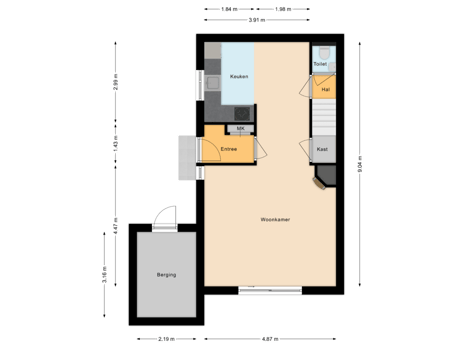 Aan de voorzijde vind je een stenen berging met elektra en handige vliering.