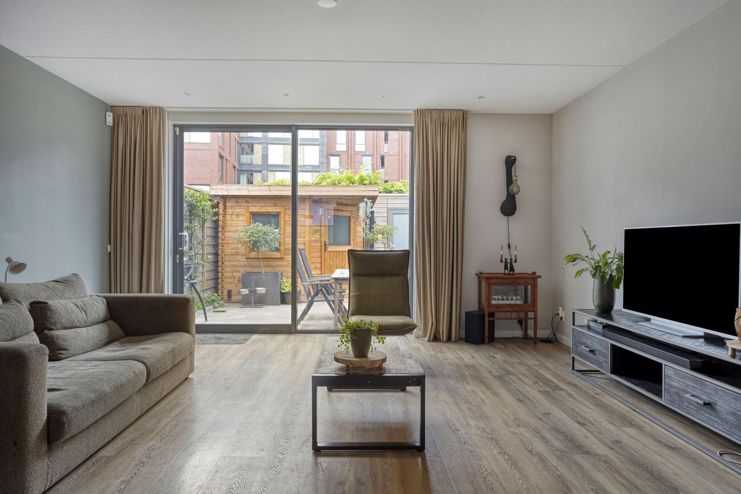 Ruime tuingerichte woonkamer met schuifpui naar de achtertuin en voorzien van trapkast.