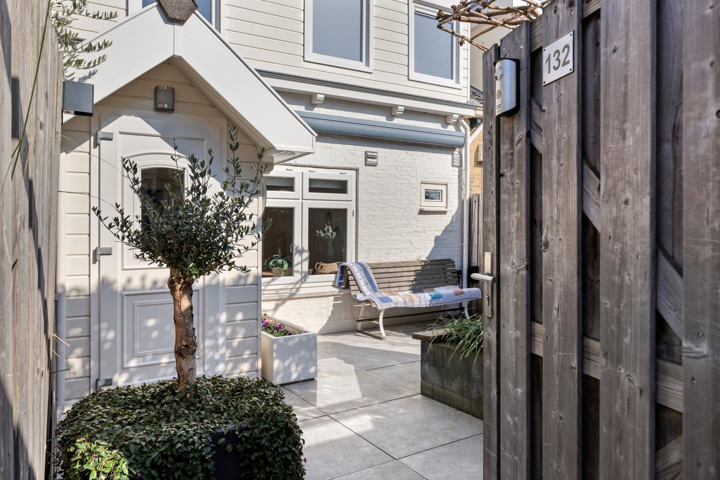 De entree van de woning is via de sfeervolle achtertuin. Via de hal heb je toegang tot de keuken.