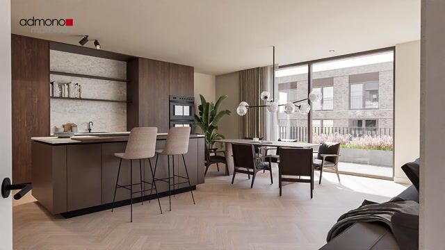 De woonkamer is open en ruim opgezet, met een mooie verdeling tussen zit- en eetgedeelte. Grote raampartijen zorgen voor een prachtige lichtinval en maken het uitzicht een vast onderdeel van je interieur. De luxe Bulthaup-leefkeuken vormt een statement in het hart van de woning. Strak ontworpen, hoogwaardige materialen en zelfs nog keuzevrijheid in afwerking en kleur. De basis is voor u uitgedacht, de detailkeuzes maken het uw persoonlijke keuken. Aan de leefruimte grenst het terras van circa 24 m². Via de brede schuifpui vloeien binnen en buiten moeiteloos in elkaar over. Het terras voelt als een extra woonkamer in de open lucht. Een heerlijke plek voor lange diners en ontspannen momenten. Kortom, genieten doet u zowel binnen als buiten.