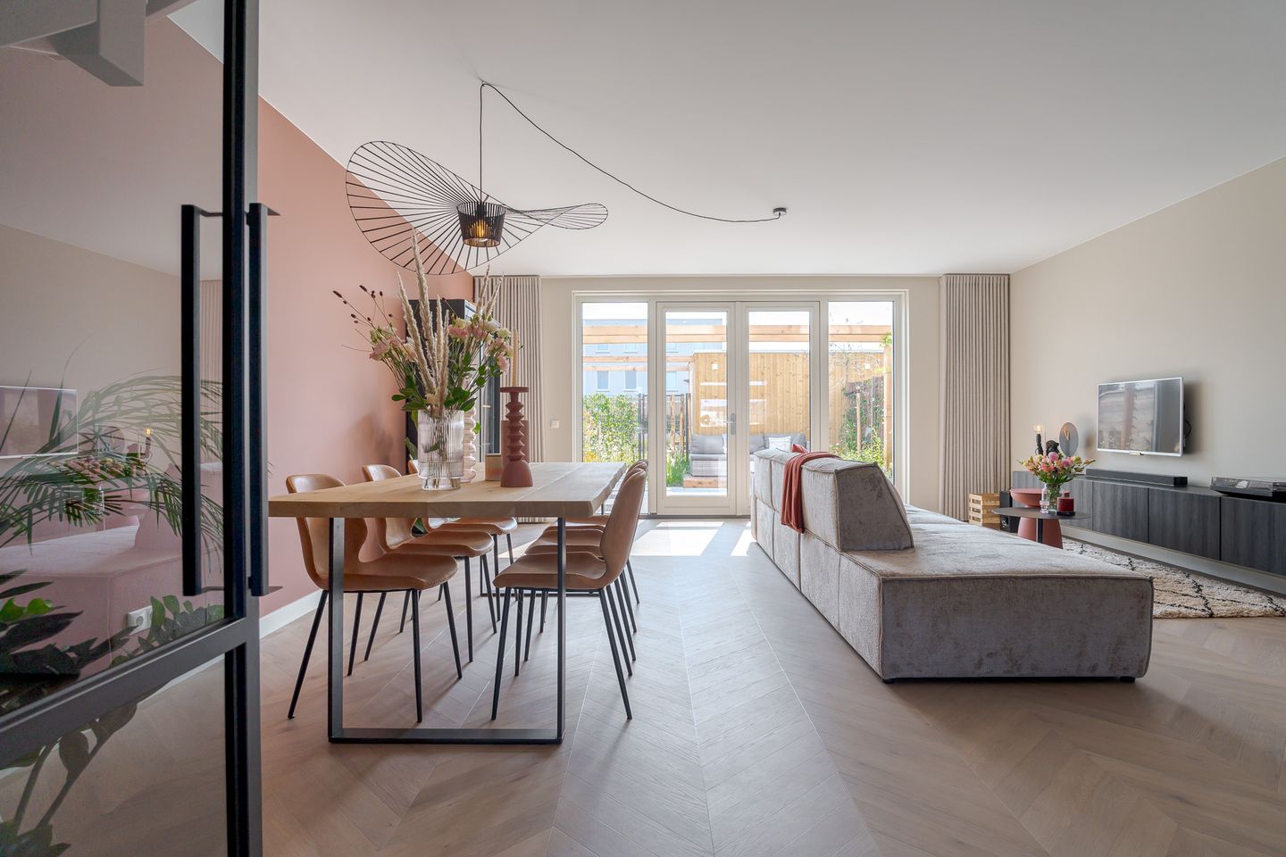 De ruime hal, met toilet en berging, leidt u naar de woonkamer. Aan de achterzijde is de zithoek gelegen, de grote pui met openslaande deuren geven zicht op de fraaie tuin. In de gehele woning geniet u van de grote hoeveelheid natuurlijke lichtinval.