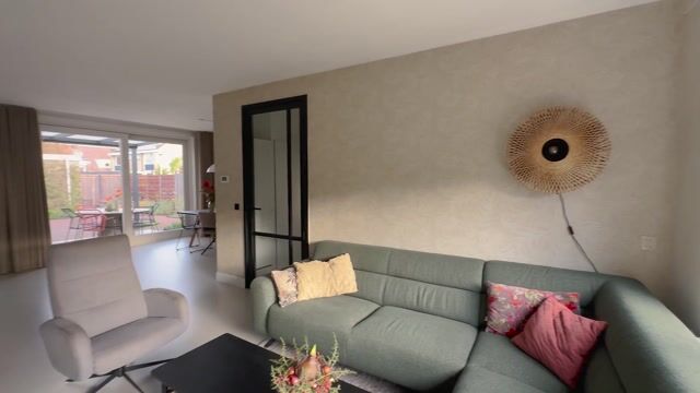 Overdekte entree aan de zijkant van het huis, hal met trapopgang, meterkast en toegang tot de toiletruimte en woonkamer. De royale L-vormige woonkamer heeft veel lichtinval door de raampartij in de voorgevel en schuifpui aan de achterzijde. Het zitgedeelte bevindt zich aan de voorzijde met hier een sfeervolle houtkachel. Aan de achterzijde is er voldoende ruimte voor het plaatsen van een grote eettafel. Vanaf de eettafel kijk je heerlijk weg de tuin in en middels een schuifpui is de tuin toegankelijk.