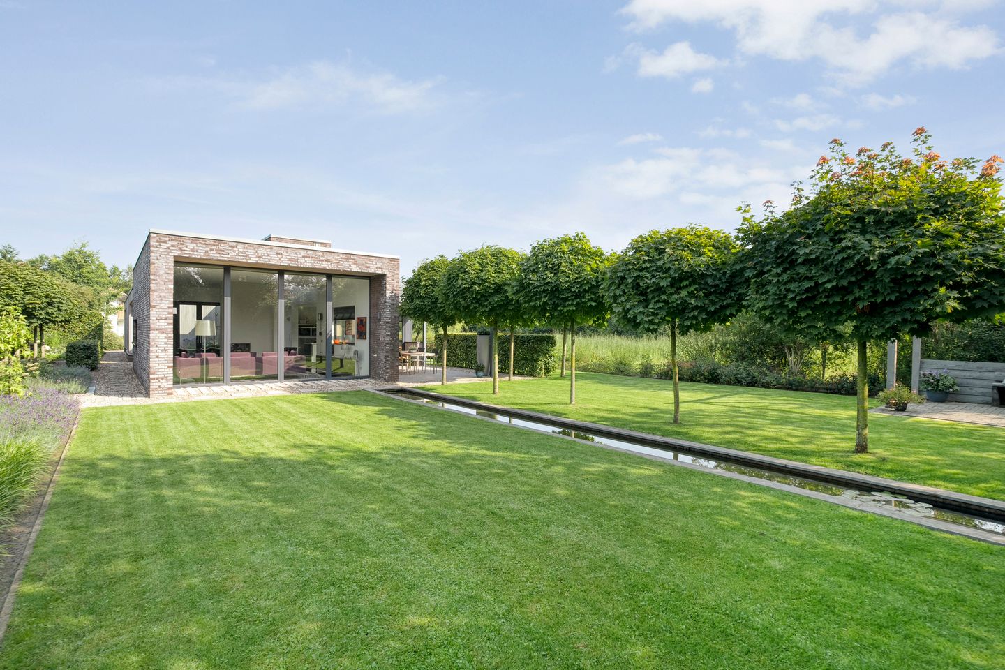 Het betreft een unieke villa met een hoogwaardig afwerkingsniveau en verschillende plafondhoogtes waardoor er een speels effect ontstaat en een bijzondere lichtinval. Kenmerkend is de centrale gang van 24 meter die een prachtige zichtlijn en koppeling vormt tussen de verschillende woonfuncties, patio's en vijver. De royale living heeft grandeur door het hoge plafond en een sfeervolle doorkijkhaard. De grote glaspartijen creëren een verbinding met het groen buiten. De open keuken met luxe inbouwapparatuur sluit aan op de overkapping en het terras. Er zijn drie (slaap)kamers, waaronder een master bedroom met vaste kastenwand en badkamer en suite. De overige slaapkamers hebben toegang tot een tweede badkamer. Verder een separate toiletruimte en een bijkeuken met veel bergruimte, wasvoorzieningen en de cv-opstelling. Rondom ligt een fraai aangelegde tuin met strakke gazons, sierlijke bomen en een spiegelende waterpartij, waardoor binnen en buiten naadloos in elkaar overlopen. De brede oprit biedt plaats aan meerdere auto’s en in de voortuin staat een houten berging voor extra opslag.