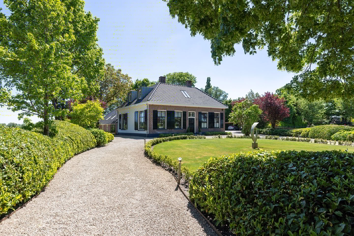 De woonboerderij zelf staat op een riant perceel van ruim 3.000 m². Aan de voorzijde vindt u een stijlvolle boerderijtuin compleet met een rotonde rondom het gazon, afgewerkt met hagen en voor de woning sieren weelderige hortensia’s. De tuin biedt volop mogelijkheden voor tuinliefhebbers, gezinnen en buitenmensen die graag genieten van rust en ruimte. Aan de achterzijde loopt ‘het binnen’ als vanzelf over in ‘het buiten’ door het perfect aansluitende terras wat direct toegankelijk is via de openslaande deuren. Platanen zorgen voor natuurlijke zonwering maar ook een elektrisch bedienbaar schaduwdoek geeft schaduw op warme dagen. Vanaf het terras heeft u kilometers vrij uitzicht over landerijen en zelfs de iconische Peperbus van Zwolle is zichtbaar.