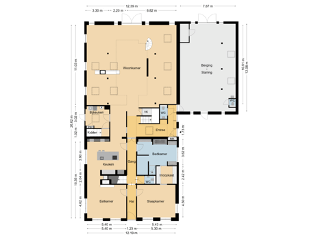 In de bijkeuken-berging zijn voorzieningen voor een wasmachine, wasdroger, koelkast en vrieskast. Tevens is hier de toegang tot de kleine oorspronkelijke kelder.