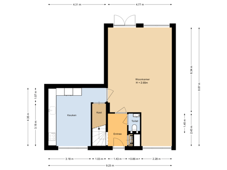 - 46 m² (9,25 meter diep en 5,00 meter breed)