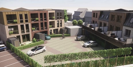 Dit plan bestaat uit 8 appartementen en 4 eengezinswoningen. Samen delen deze appartementen en woningen een binnenterrein waar 12 privé parkeerplaatsen zullen komen.