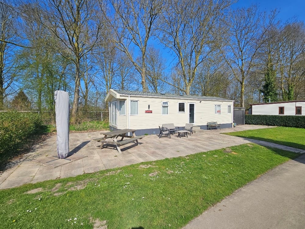 De heerlijke tuin rondom de stacaravan is voorzien van een betegeld terras en heeft een heerlijke zonligging. De tuin biedt daarnaast plaats aan een ruime vrijstaande berging (2,60 x 2,60).