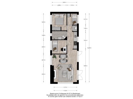 Met een woonoppervlakte van 53,5 m² is de bungalow efficiënt en comfortabel ingedeeld. Alle vertrekken beschikken over vloerverwarming en een hoogwaardige PVC-vloer in vergrijsd eiken tint.
