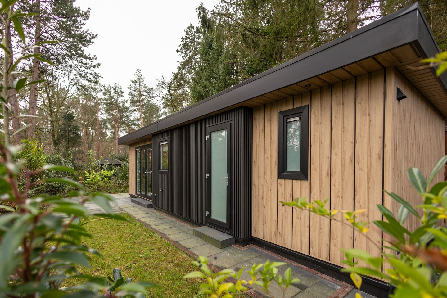 Het chalet betreft een Eco Cube type met een afmeting van circa 10,50 x 4,25 meter en is gebouwd met oog voor duurzaamheid en modern wooncomfort. De kunststof buitenbekleding zorgt voor een onderhoudsvriendelijke en eigentijdse uitstraling. Dankzij het unieke ontwerp, de grote raampartijen en openslaande deuren is er veel lichtinval en een directe verbinding met de natuur rondom het chalet.