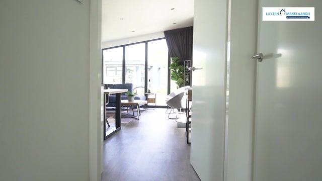 Bij binnenkomst staat u direct in de hal welke toegang biedt tot alle ruimtes, waaronder de woonkamer. Hoge plafonds en grote raampartijen creeren een ruimtelijk gevoel en maken dat de woning geniet van bijzonder veel lichtinval. Deze ramen fungeren niet alleen als kijkvensters naar de groene omgeving maar ook als schuifpui, waardoor binnen en buiten naadloos in elkaar overlopen.