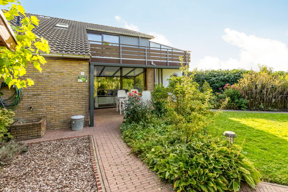 Achtertuin met veel groen. Aan de woning is een fijne overkapping gebouwd, waardoor je lekker beschut op het terras kunt zitten.
