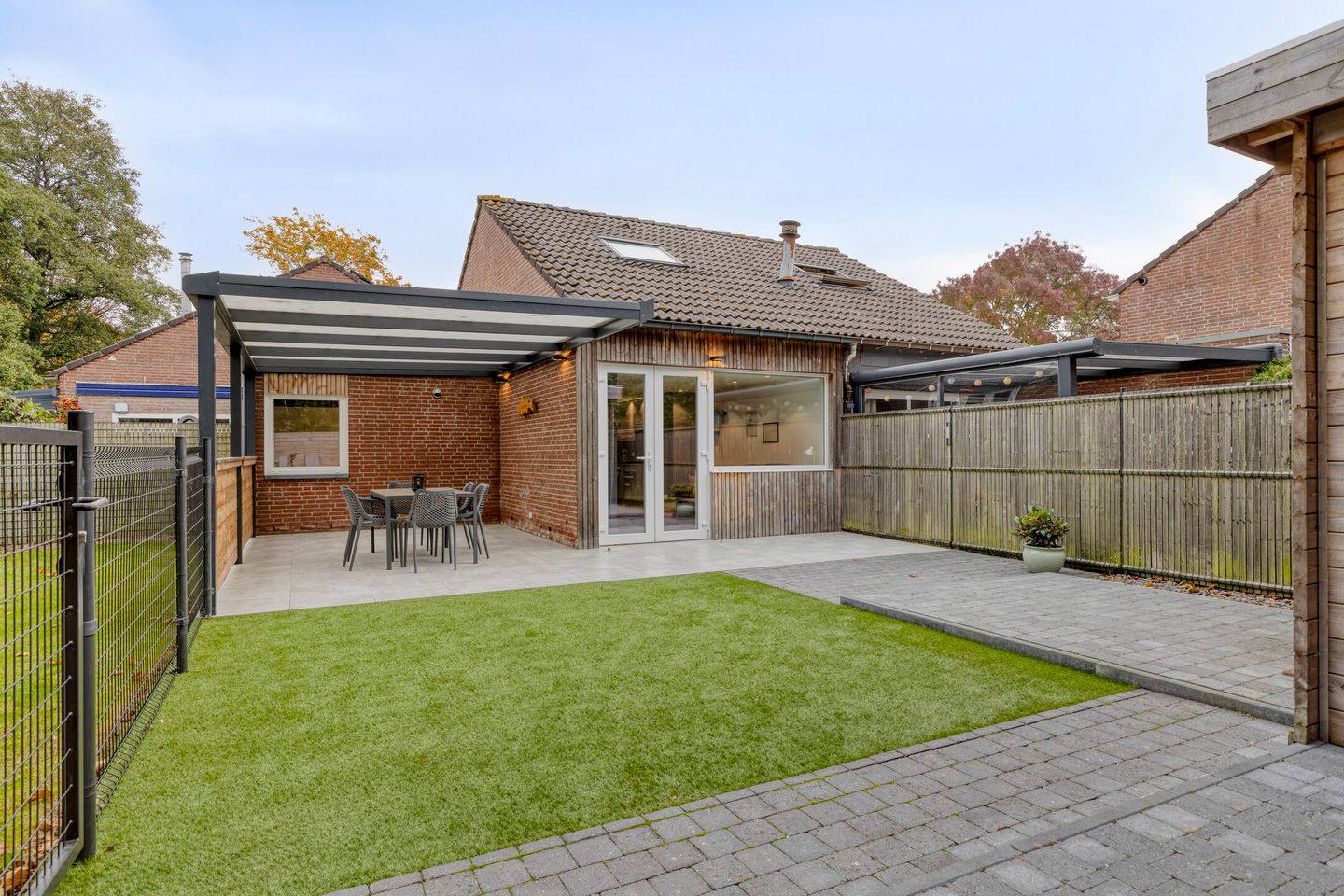 Via de openslaande deuren stapt u de fraai aangelegde achtertuin in. Hier vindt u een ruim overdekt terras waar u heerlijk kunt tafelen of barbecueën in de zomer. Naast de vrijstaande houten berging met elektra is er nog een gezellige zithoek gecreëerd, ideaal om te genieten van de avondzon. Voor de elektrische fietser zijn er vier oplaadpunten aanwezig. De tuin is volledig omheind en grenst aan de bosrand, wat zorgt voor veel privacy en een groene, rustige omgeving.