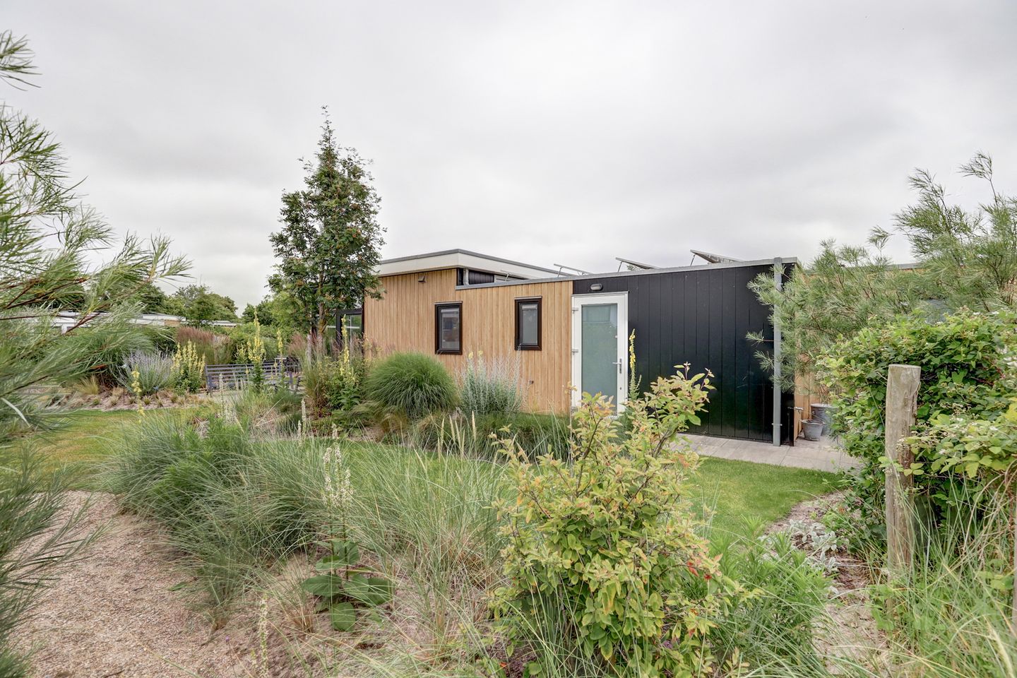 Bij het chalet hoort een geïsoleerde berging van circa 8 m², waar onder andere de elektrische boiler en omvormer voor de zonnepanelen zijn geplaatst. Daarnaast is er volop ruimte voor fietsen, tuingereedschap en andere praktische benodigdheden. Het perceel van 411 m² erfpachtgrond (met erfpachtrecht tot 2068) biedt bovendien een eigen parkeerplaats en een fijne tuin rondom het chalet.