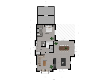 Via de stijlvolle entree betreedt u een zeer royale hal die toegang biedt tot alle belangrijke vertrekken. Vanuit hier bereikt u onder meer de meterkast, de stookruimte met cv-installatie en doorstroomboiler, een modern gastentoilet, de trapopgang en een praktische inpandige berging met witgoedaansluitingen. Tevens bevindt zich op de begane grond een comfortabele slaapkamer met een luxe en-suite badkamer, uitgerust met een inloopdouche met draingoot, toilet en een wastafelmeubel — ideaal voor gelijkvloers wonen of gastenverblijf.