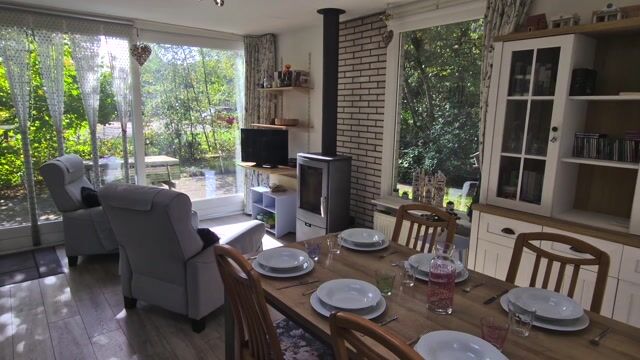 Bij binnenkomst voelt de woonkamer direct uitnodigend aan. De royale ruimte is sfeervol ingericht, met een comfortabele zithoek rond de **houtkachel** die zorgt voor een aangename warmte op koelere dagen. Grote ramen laten het daglicht volop binnenstromen, waardoor de woonkamer licht en levendig aanvoelt. De **schuifpui** verbindt binnen met buiten op zonnige dagen zet u de deuren open en geniet u van de rust van de tuin. Hier komt u helemaal tot rust met een boek, een goed glas wijn of in goed gezelschap.