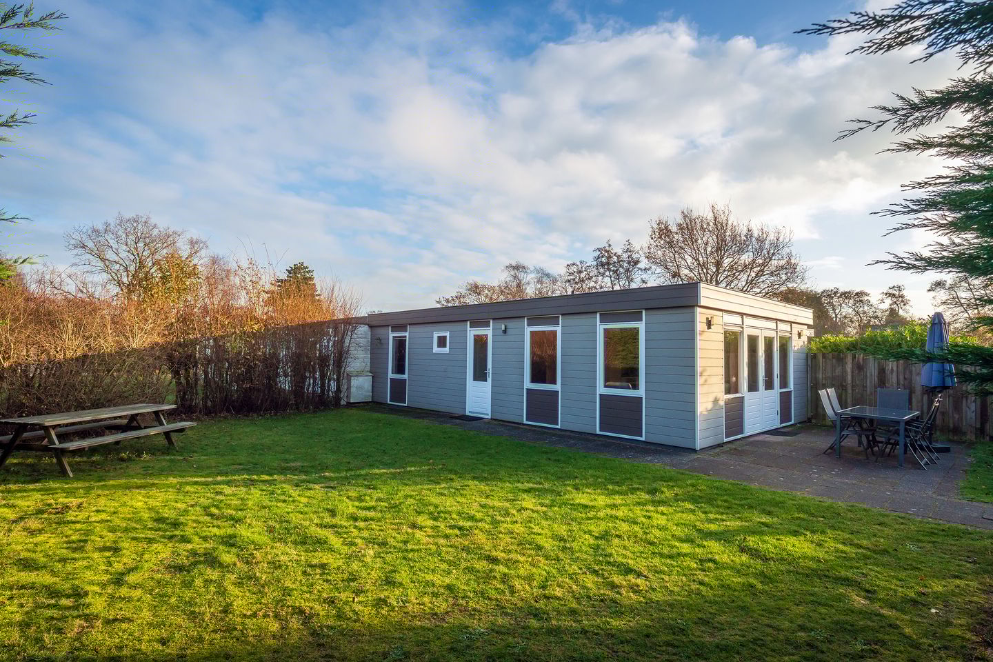 De tuin rondom de bungalow is ruim en groen aangelegd. Er is een zonnig terras waar u heerlijk kunt ontspannen, en een houten tuinberging die extra bergruimte biedt voor fietsen, tuingereedschap of strandspullen. Het perceel beschikt bovendien over twee eigen ruime parkeerplaatsen, wat het gebruiksgemak verder vergroot.