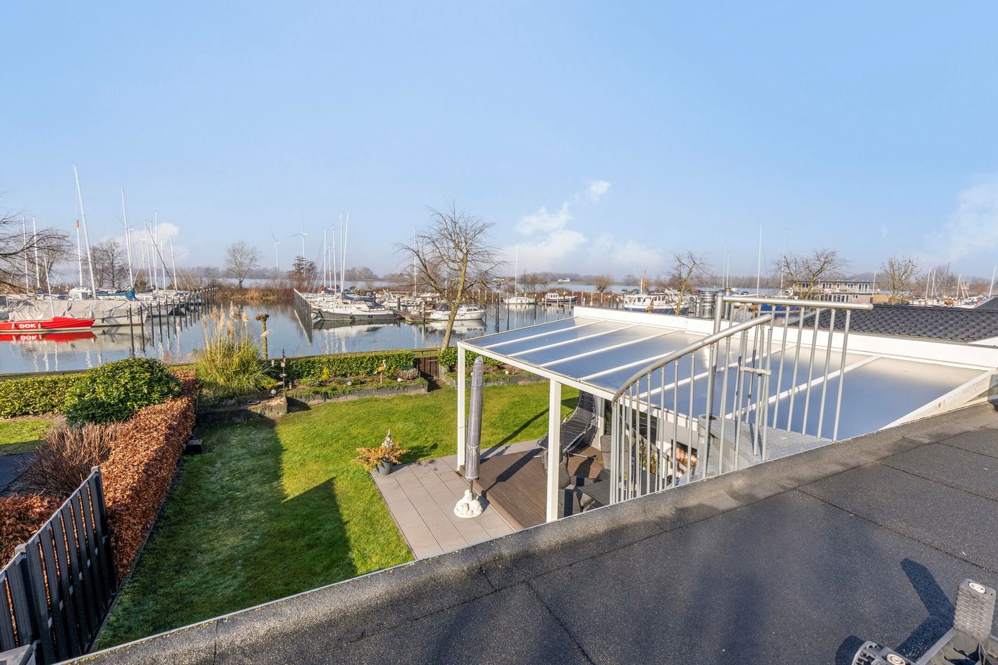 De riante achtertuin naast het chalet (175 m²) is zonnig gelegen en heeft een schitterend vrij uitzicht op de jachthaven. De tuin is voorzien van een grote kunststof overkapping (7,05 x 3,20) met vlonderterras en open haard. Verder is de tuin voorzien van tegels, gras en plantenborders en omheind door een hekwerk, een stalen trap biedt toegang tot het dak, waar eenvoudig een dakterras gemaakt kan worden.