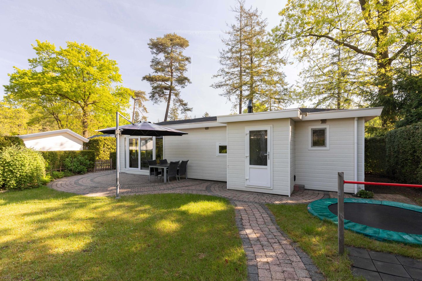 De recreatiewoning bevindt zich op een rustige plek op het park, omringd door groen en voorzien van een royale tuin met veel privacy. Dankzij de ligging op het zuiden geniet u hier optimaal van de zon, en de ruime terrassen maken het mogelijk om tot in de late uurtjes buiten te zitten. Voor de kinderen is er volop ruimte om te spelen, met een eigen trampoline in de tuin. Daarnaast vindt u op het perceel een praktische berging en een buitenbarbecue – ideaal voor zomerse dagen.