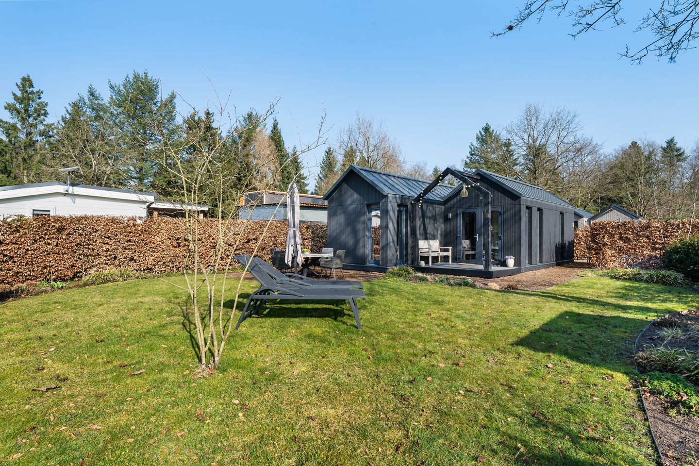De tuin is onder architectuur van Studio May & June is aangelegd (die in elk seizoen mooi is). Het is een echte bostuin waar natuur en rust centraal staan. Op verschillende plekken kun je ontspannen, een boek lezen of genieten van een goed glas wijn terwijl de zon ondergaat. Vogels, ritselende bomen en frisse boslucht maken het buitenleven hier compleet.