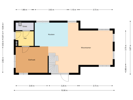 Middels de entree aan de zuidzijde betreedt u de woning in de woonkamer. De woonkamer loopt over in een open keuken met eethoek en beschikt over de trapopgang naar de verdiepingen. Gelegen naast de eethoek bevindt zich een hal met een tweede entree en een separat toilet.