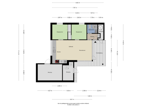 Van buitenaf zijn 3 afzonderlijke bergruimtes te bereiken. In één daarvan bevindt zich het buffervat voor de warmtepomp en in één van de andere de aansluitingen voor het witgoed. De derde berging is geschikt voor het stallen van fietsen of bijvoorbeeld tuingereedschap.