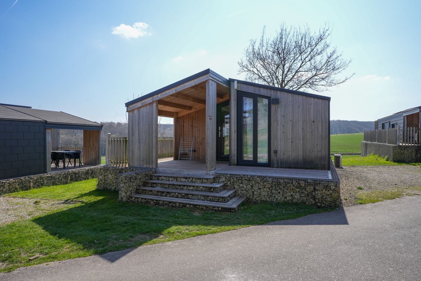 Kenmerkend voor de duurzame woning van het type Panorama Cottage 4 zijn de twee grote, deels overdekte terrassen aan de voor- en achterzijde. Hierdoor kunt u de hele dag buiten zitten, ook als er een zomerse regenbui is. Vanaf het terras aan de achterzijde heeft u fraai uitzicht naar het hellingbos.