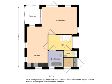 Indeling begane grond: Indeling begane grond: ruime entree, separaat toilet, badkamer met douche en wastafel, woonkamer met openslaande tuindeuren, schuifpui naar veranda, open keuken. Van buitenaf toegankelijke meterkast en CV ruimte. Verdieping: overloop, tweemaal een ruime 2-persoons slaapkamer en een bergruimte/kast.