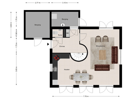 Bij binnenkomst via de entree stap je in een royale hal die direct toegang biedt tot het toilet, de meterkast, de trapopgang en de sfeervolle woonkamer. Vanuit de hal bereik je ook de inpandige berging met CV-ketel en witgoedaansluitingen – een praktische ruimte met volop opbergmogelijkheden. De lichte woonkamer valt direct op door de grote raampartijen en meerdere openslaande deuren naar de voortuin, waardoor binnen en buiten naadloos in elkaar overlopen. Extra lichtinval wordt gecreëerd door een extra zijraam, wat de ruimte nog ruimtelijker en aangenamer maakt. De ronde wand, waarachter zich de elegante wenteltrap bevindt, geeft de kamer een speels en eigentijds karakter. De open verbinding met de nette hoekkeuken zorgt voor een gevoel van eenheid en ruimtelijkheid. De keuken is uitgerust met alle benodigde inbouwapparatuur en biedt voldoende ruimte voor een royale eettafel – ideaal om uitgebreid te tafelen met familie of vrienden.