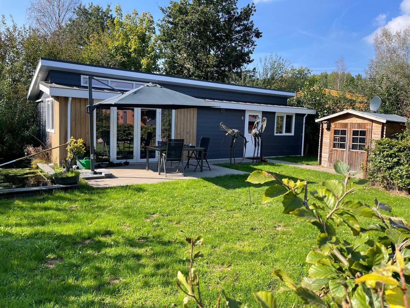 Met een woonoppervlakte van ca. 46 m² is het chalet slim ingedeeld en biedt het lichte leefruimtes met uitzicht op de tuin en vijver. De buitenzijde is onderhoudsarm dankzij kunststof gevels en kozijnen met dubbel glas. Het eigentijdse felsdak benadrukt de moderne uitstraling. Het chalet is voorzien van verwarming en warm water via een cv-installatie (propaan) en beschikt bovendien over airconditioning. De houten berging op het perceel biedt praktische opslag, al verdient deze aandacht of vervanging.