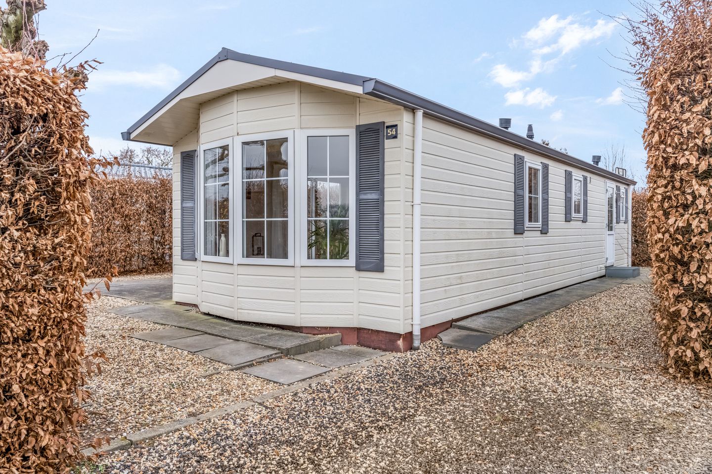 Chalet nummer 54 is beschut gelegen op het park en biedt daardoor veel privacy en een rustige ligging. Het chalet is gebouwd in onderhoudsvriendelijke volkern rabatdelen, heeft kunststof kozijnen en is volledig geïsoleerd.