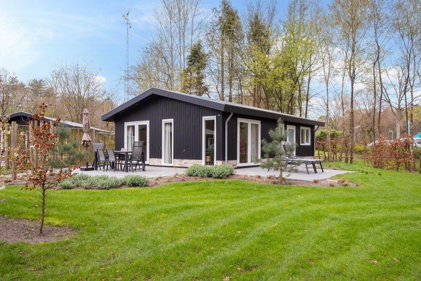 De royale tuin biedt volop privacy en een fraai uitzicht op het omliggende bos. Met twee gemeubileerde terrassen en praktische buitenstopcontacten is het hier optimaal genieten. Het ruime gazon biedt volop speelruimte voor kinderen. Daarnaast beschikt de woning over een eigen parkeerplaats.