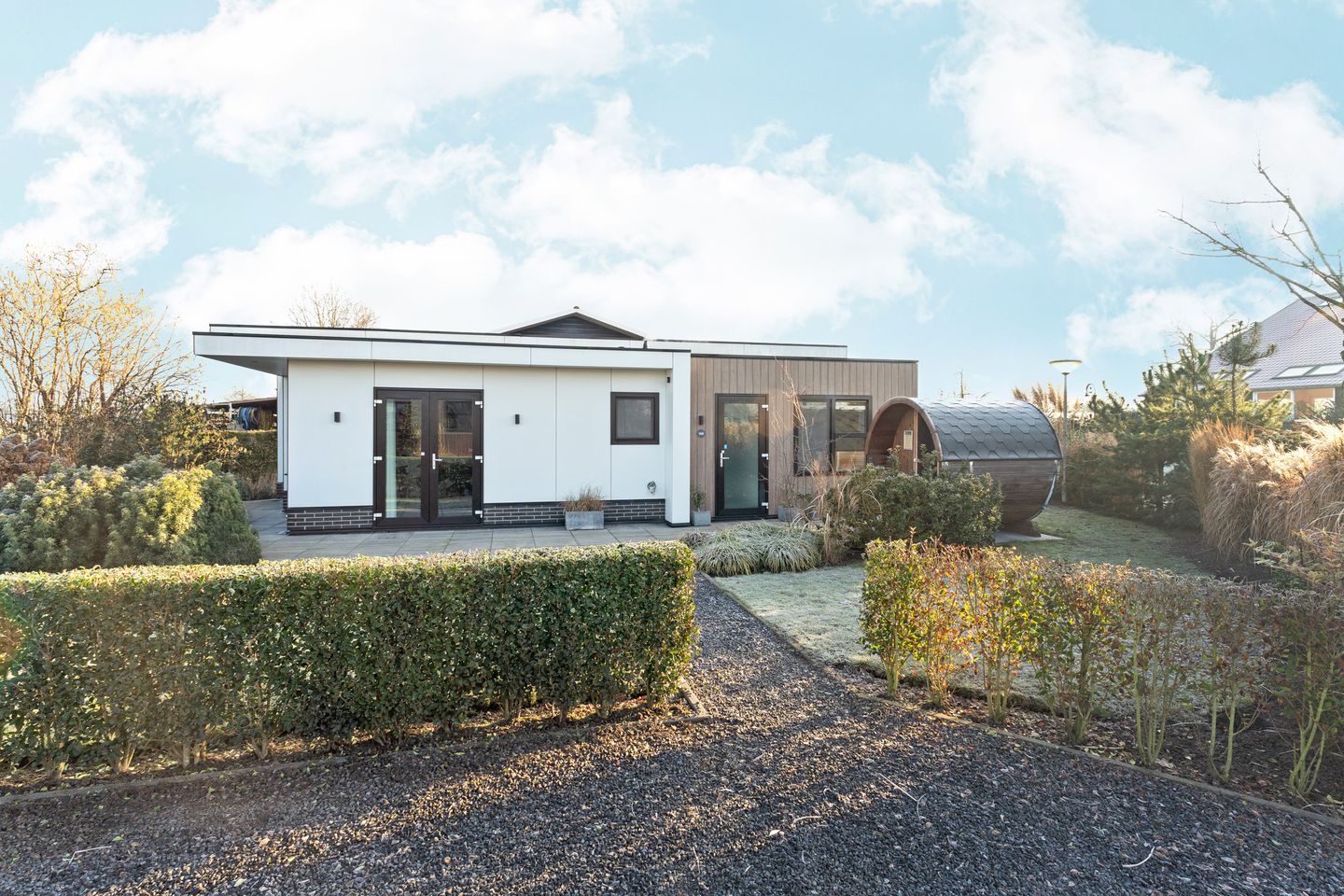 Het woongedeelte met open keuken is sfeervol en licht, met hoogwaardige meubels en een warme visgraatvloer in lichthoutkleur. De keuken is uitgevoerd met witte kastjes en een marmerlook aanrechtblad dat luxe uitstraalt en onderhoudsvriendelijk is. U beschikt over een gasfornuis, vaatwasser, koel/vries combinatie en combioven met magnetronfunctie. Via de openslaande deuren loopt u het terras op, aangelegd met een combinatie van strakke tegels en groen. In een privéhoek van het ruime perceel bevindt zich een sauna, waar u in alle rust kunt genieten van het vrije uitzicht over de omliggende landerijen.