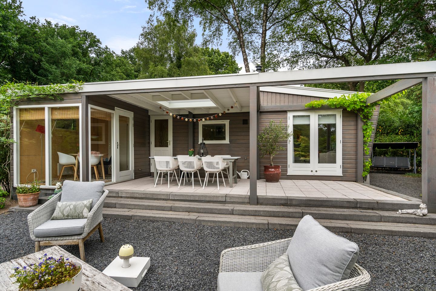 Exterieur: Rondom het chalet ligt een fraai aangelegde tuin die rust en privacy uitstraalt. De tuin is voorzien van een mooie combinatie van bestrating, siergrind en groene beplanting, waardoor er een natuurlijke en verzorgde uitstraling ontstaat. Grenzend aan het chalet vindt u een royaal terras met een overkapping. Een heerlijke plek om beschut buiten te zitten of het nu zonnig is of licht regent. Dankzij de gunstige ligging geniet u hier van fijn zonlicht gedurende de dag met zowel zonnige als schaduwrijke plekken om te ontspannen. De tuin biedt volop mogelijkheden om op meerdere plekken een loungeset of zitje te plaatsen, zodat u altijd een comfortabel plekje kunt vinden om te genieten van de rust en natuur. Aan de voorzijde van het perceel bevinden zich een vrijstaande houten berging en een eigen parkeerplaats op eigen terrein.
